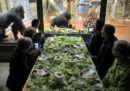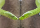 Una ventina di capre sono al lavoro nella zona di Riverside Park, a New York, per aiutare a ripulire la zona da erbacce e piante invasive: sono lì per lavorare, GOATS AT WORK, insomma, come sottolinea il cartello vicino a cui sono state fotografate. Valeva la pena mettere in questa raccolta anche un cavallo legato fuori da un seggio elettorale in Inghilterra, e due animali sdoppiati con giochi di riflessi: un pappagallo ara giallo-blu e un mamba verde occidentale, uno dei più velenosi serpenti al mondo. Poi lucciole, tavole imbandite per mangiare con i gorilla e lumache su belle foglie con gocce di pioggia.
