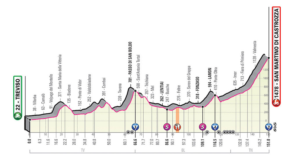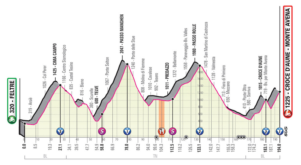 La tappa di oggi non dovrebbe stravolgere la classifica, perché c’è solo una vera salita nel finale, che porta a San Martino di Castrozza, e non è tra le più difficili di questo Giro: è lunga 13 chilometri e ha una pendenza media del 5,6 per cento (il Mortirolo, da cui si è passati martedì, aveva invece una pendenza media del 10 per cento). È una salita pedalabile, in cui stare a ruota, sfruttando la scia di chi sta davanti, è molto vantaggioso. Si affronterà a una velocità sostenuta e sarà difficile attaccare e creare grandi distacchi tra sé e gli altri. Ma probabilmente qualcuno ci proverà lo stesso, visto che dopo quasi tre settimane passate a pedalare, le energie sono ormai quello che sono e anche salite pedalabili possono diventare complicate.