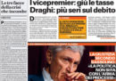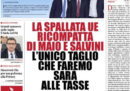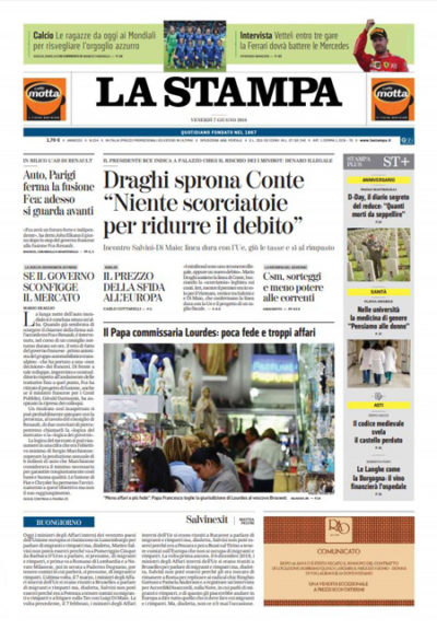 I giornali di oggi dedicano l’apertura a notizie diverse: l’incontro fra i leader della Lega Salvini e del Movimento 5 Stelle Di Maio per rilanciare l’azione del governo, la rinuncia di FCA alla ricerca di un accordo per la fusione con Renault, le parole del presidente della Banca Centrale Europea Draghi sul debito dell’Italia e sull’ipotesi di creare titoli di stato di piccolo taglio (i “minibot”). Il Fatto continua a seguire l’inchiesta su Palamara e sui rapporti fra magistratura e politica, il Manifesto titola su occupazione e inquinamento all’ILVA di Taranto, e il Giornale si occupa degli effetti del reddito di cittadinanza.