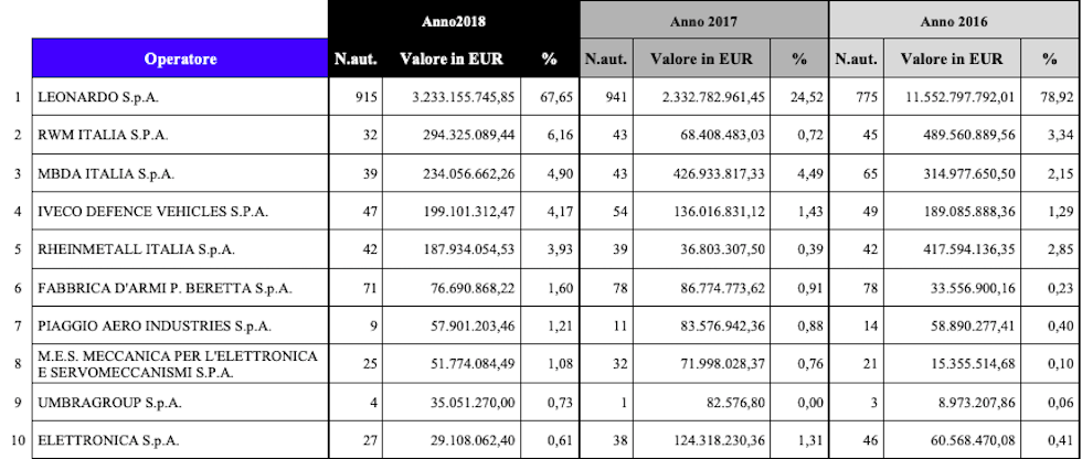 Prima: nel documento si segnala che nel 2018 il valore delle autorizzazioni concesse dal governo per l’esportazione di armi è quasi dimezzato rispetto ai dati riferiti al 2017: è passato da un valore di 10 a un valore di 5,2 miliardi di euro. Questo calo potrebbe far pensare a una strategia più prudente del governo guidato da Giuseppe Conte rispetto agli ultimi di centrosinistra (governo Conte che peraltro si è insediato solo a giugno 2018). In realtà, scrive Beretta, è un calo «fisiologico», dovuto agli enormi ordini di armi ricevuti negli ultimi anni dall’Italia: «si tratta di oltre 32 miliardi di euro nel triennio 2015-2017, in gran parte per sistemi militari complessi (aerei, elicotteri, navi, ecc), la cui produzione sta impegnando e terrà impegnate le nostre aziende militari per diversi anni».