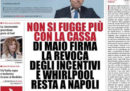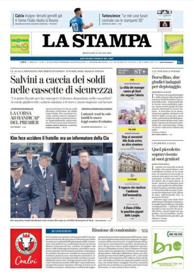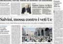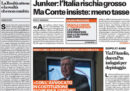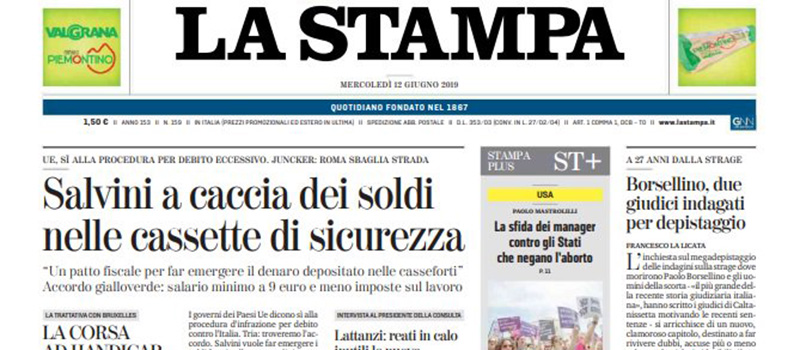 Le due notizie principali in apertura sui giornali di oggi sono la proposta del ministro dell’Interno Salvini di tassare i risparmi nelle cassette di sicurezza, e la trattativa con l’Europa sul debito, per la quale i giornali vedono una contrapposizione fra il presidente del Consiglio Conte e il ministro dell’Economia Tria da una parte e i due vicepremier Di Maio e Salvini dall’altra. Avvenire e il Manifesto titolano sull’approvazione al Consiglio dei ministri del “decreto sicurezza bis”, la Verità attacca Avvenire perché non è anti-islam, mentre i giornali sportivi commentano la vittoria dell’Italia sulla Bosnia nelle qualificazioni per gli Europei dell’anno prossimo.