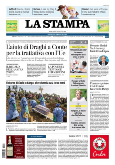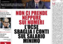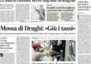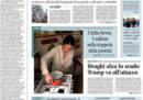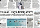 L’apertura della maggior parte dei giornali di oggi è dedicata a notizie legate all’economia: le parole del presidente della Banca Centrale Europea Draghi (criticate dal presidente degli Stati Uniti Trump) che ha ipotizzato di ridurre i tassi di interesse e di avviare nuovamente il Quantitative easing, l’acquisto di titoli di stato dei paesi dell’Unione Europea in difficoltà, la trattativa fra Italia e Unione Europea per la riduzione del debito, e le discussioni nel governo sulla riduzione delle tasse e sui “minibot”. Il Messaggero apre con un articolo del suo direttore che chiede le dimissioni della sindaca di Roma Raggi, il Dubbio si occupa delle possibili modifiche alle norme sulle intercettazioni, il Fatto titola sulla proposta del Movimento 5 Stelle sul salario minimo, e Libero commenta i dati dell’ISTAT sull’evasione fiscale.