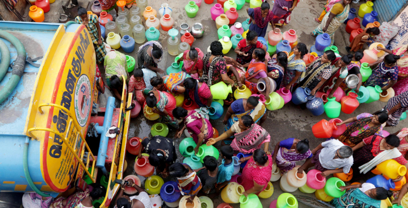 In India soltanto una casa su quattro è collegata alla rete idrica, e ogni anno circa 200mila persone muoiono per motivi legati alla scarsità d’acqua. Un’abitazione nelle periferie di Chennai può normalmente contare soltanto su 30-40 litri di acqua al giorno: in questi giorni di ulteriori privazioni, le condizioni sanitarie stanno peggiorando notevolmente. L’India fa tradizionalmente affidamento sulle falde acquifere, che però sono state eccessivamente sfruttate in tempi recenti con la conseguenza che il paese è molto esposto alle siccità, e spesso dipendente interamente dalle piogge. La situazione non sembra destinata a migliorare, visto che si stima che la popolazione del paese aumenterà di altre 300 milioni di persone entro il 2050, rendendolo il più abitato del mondo.