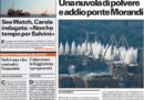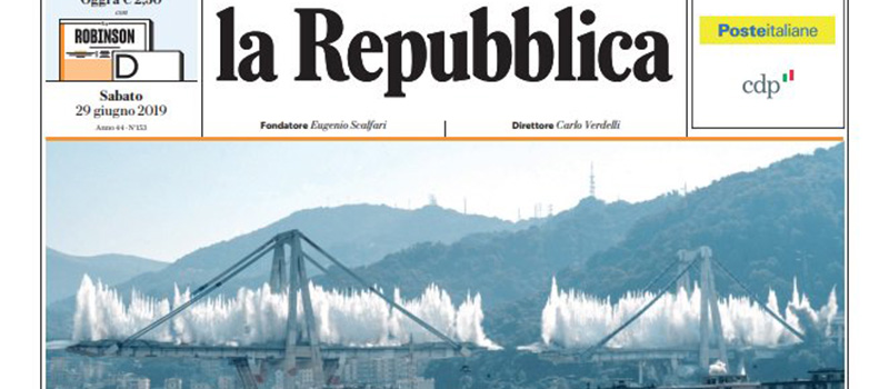 La demolizione dei piloni 10 e 11 del ponte Morandi di Genova con un’esplosione controllata è in apertura su molti giornali di oggi, con grandi foto del momento dell’esplosione delle cariche. Le altre notizie principali sulle prime pagine sono la vicenda della nave Sea Watch 3, le accuse di Di Maio a Atlantia e le reazioni di imprese e sindacati, la trattativa fra Italia e Unione Europea sulla procedura di infrazione per il debito e quella per la nomina dei nuovi vertici delle istituzioni europee, l’indagine sui concorsi truccati all’Università di Catania, la gestione del comune di Roma (in apertura su Messaggero e il Tempo), mentre i giornali sportivi si occupano di calciomercato, della sentenza che esclude il Milan dalle coppe europee per l’anno prossimo, e della partita di oggi fra Italia e Olanda per i quarti di finale dei Mondiali femminili.