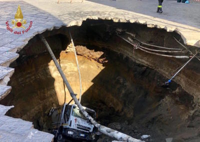 A Casoria, in provincia di Napoli, un camion dei rifiuti è precipitato in una voragine che si è aperta in mezzo alla strada in largo San Mauro. L’incidente è stato lunedì mattina intorno alle 6: il buco che si è aperto, a causa di un cedimento sotto la strada, è profondo circa 12 metri e largo 8. L’autista del camion è stato recuperato dai vigili del fuoco ed è solo lievemente ferito. A causa dell’incidente, che ha provocato anche la rottura di una conduttura del gas, sono state evacuate le case e i negozi intorno a largo San Mauro.