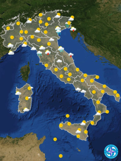 Le minime saranno in calo generale al Nord e sulle zone adriatiche centrali, mentre dovrebbero aumentare sulle regioni tirreniche e sulle isole. Le massime saranno in calo al Nord, e senza variazioni significative sul resto dell’Italia.