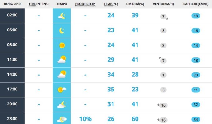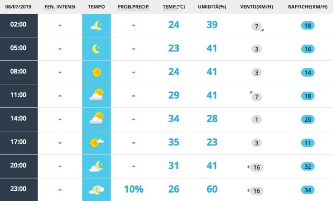 A Milano sarà per lo più soleggiato e ventilato verso sera. Le temperature oscilleranno tra i 23 °C e i 35 °C nel tardo pomeriggio.