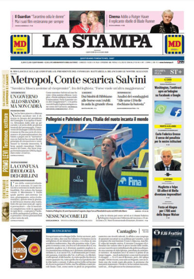 Tutte i giornali di oggi dedicano l’apertura all’intervento del presidente del Consiglio Conte al Senato per riferire sulla vicenda dei rapporti fra Lega e Russia e sui finanziamenti illegali al partito che sarebbero stati trattati da Savoini con alcuni uomini russi, sottolineando anche la scelta del Movimento 5 Stelle di non partecipare alla discussione per protestare contro l’assenza di Salvini e le parole di martedì di Conte sulla TAV. I giornali sportivi festeggiano le vittorie di Federica Pellegrini nei 200 stile libero e di Gregorio Paltrinieri negli 800 stile libero ai Mondiali di nuoto, notizia presente su quasi tutte le prime pagine di oggi con grandi foto dei due nuotatori.
