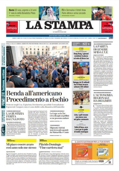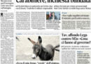 Tutti i giornali di oggi aprono sulla vicenda del carabiniere ucciso a Roma nella notte fra giovedì e venerdì scorso: i titoli riguardano le indagini per ricostruire la dinamica degli avvenimenti, le polemiche sulla foto di uno dei sospettati legato e bendato in una caserma dei carabinieri, e la partecipazione alla camera ardente. Fa eccezione solo il Fatto, che apre sulla mozione contro la TAV presentata dal Movimento 5 Stelle, nuovo elemento di tensione nella maggioranza di governo.