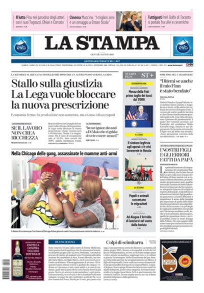 Sono due le notizie principali in apertura sui giornali di oggi: il Consiglio dei ministri di ieri che doveva discutere della riforma della giustizia presentata dal ministro Bonafede sulla quale non si è trovato un accordo fra Lega e Movimento 5 Stelle, e i dati diffusi dall’ISTAT su economia e occupazione che confermano la crescita zero per il secondo trimestre. Il Giornale intervista Silvio Berlusconi che annuncia la fondazione di L’Altra Italia, una federazione di centro per superare Forza Italia, il Fatto apre sugli arresti in Calabria per rapporti fra politica e ‘ndrangheta, il Manifesto si occupa degli incendi di boschi in Siberia, e la Verità attacca l’ex sottosegretario Gozi per il suo ruolo nel governo francese.
