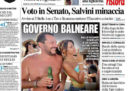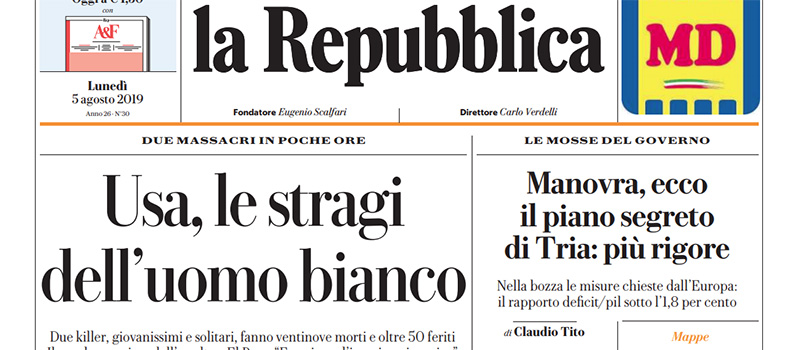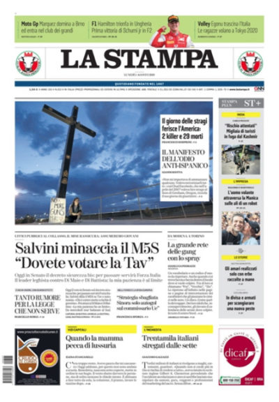Le due notizie principali in apertura sui giornali di oggi sono l’esame che inizia oggi al Senato del decreto “sicurezza bis”, sul quale il governo chiederà il voto di fiducia, e le due stragi negli Stati Uniti, dove due uomini armati a El Paso e a Dayton hanno ucciso ventinove persone sparando tra la folla in un supermercato e per strada. Il Giornale apre invece sull'”ossessione” della sinistra per Salvini, il Fatto titola sui vitalizi della regione Sicilia, la Verità continua la sua campagna sulla vicenda di Bibbiano, e Libero pubblica un sondaggio sulla sfiducia degli italiani nella magistratura.