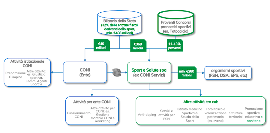 Secondo il disegno di legge approvato dal Senato, il 32 per cento delle entrate fiscali derivate dallo sport che lo Stato versa annualmente al CONI (il quale a sua volta finanziava il CONI Servizi) verrebbe ora diviso tra CONI e Sport e Salute prima del versamento. I 408 milioni di euro previsti per quest’anno si dovranno quindi dividere in questa misura: 40 milioni al CONI per il finanziamento della preparazione olimpica di alto livello e della giustizia sportiva, e 368 milioni a Sport e Salute per gli organismi sportivi, il funzionamento del CONI, l’antidoping, le strutture territoriali e la promozione sportiva.