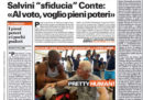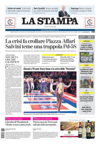 La crisi di governo è la notizia in apertura su tutti i giornali di oggi: i titoli si concentrano sulla mozione di sfiducia al governo presentata dalla Lega, sulle reazioni dei mercati, con il calo della Borsa di Milano e la crescita dello spread, e sulle ipotesi sui prossimi passaggi, con la Lega che spinge per le elezioni anticipate mentre negli altri partiti ci sarebbe chi cerca un’intesa per rinviare la data del voto.