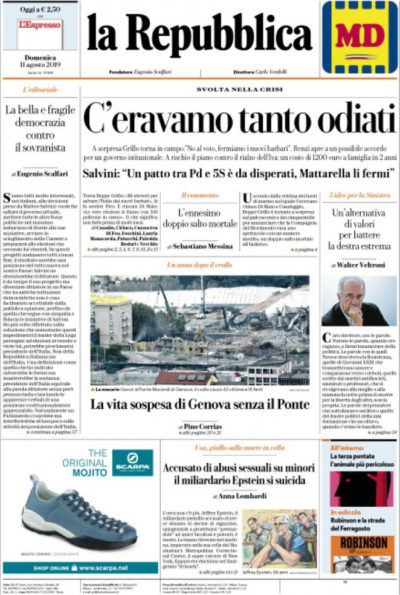 Anche oggi i giornali continuano a parlare della crisi di governo, con le dichiarazioni di tutti i principali politici italiani e con le analisi di un possibile governo che potrebbe venirsi a creare per evitare elezioni in autunno. Sui giornali si parla anche della morte in carcere, forse per suicidio, del noto finanziere statunitense Jeffrey Epstein.
