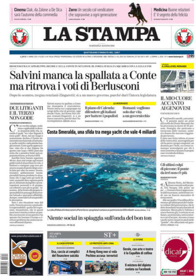 Tutte sulla crisi di governo, poi le proteste di Hong Kong e l'arrivo dell'anniversario del crollo del ponte Morandi