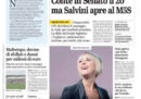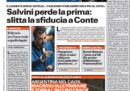 L’apertura di tutti i giornali di oggi è dedicata al voto in Senato sul calendario dei lavori e sulla discussione della mozione di sfiducia nei confronti del presidente del Consiglio Conte presentata dalla Lega, durante il quale una maggioranza composta da Movimento 5 Stelle, Partito Democratico e altri partiti minori ha deciso che Conte riferirà in aula sulla crisi politica il 20 agosto, prima del voto sulla mozione di sfiducia. L’altra notizia della giornata è la proposta del leader della Lega Salvini di votare insieme al Movimento 5 Stelle il provvedimento sulla riduzione dei parlamentari e di sciogliere le camere subito dopo per andare a elezioni anticipate, proposta che restituisce ai 5 Stelle la responsabilità della prossima mossa.