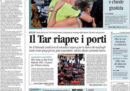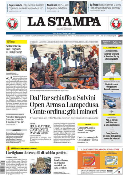 La notizia principale in apertura sui giornali di oggi è la decisione del TAR del Lazio di accogliere il ricorso della ong spagnola Open Arms contro il divieto di ingresso nelle acque italiane della sua nave con a bordo circa 150 migranti salvati nel Mediterraneo; decisione che divide di nuovo il governo, con il ministro dell’Interno Salvini che annuncia un ricorso al Consiglio di Stato e il presidente del Consiglio Conte che chiede di far sbarcare i minori. Altri giornali titolano sulla celebrazione a Genova nel primo anniversario del crollo del ponte Morandi, mentre il Sole 24 Ore si preoccupa per i dati negativi sulla crescita economica di Germania e Stati Uniti.
