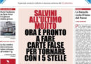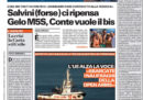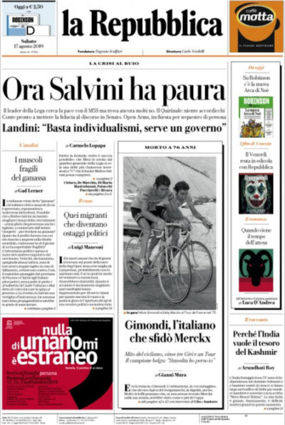 La crisi politica continua comprensibilmente a essere sulle prime pagine dei giornali di oggi, che attribuiscono al segretario della Lega Matteo Salvini un più o meno disperato tentativo di riconciliarsi con il leader del Movimento 5 Stelle Luigi Di Maio. Ma si parla anche della morte del ciclista Felice Gimondi, così come della nave Open Arms.