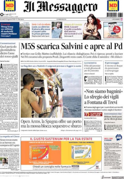 C’è ancora molta politica italiana, sulle prime pagine di oggi. Nei titoli di apertura si parla soprattutto dell’esito dell’incontro tra i dirigenti del Movimento 5 Stelle, domenica a casa di Beppe Grillo, in cui sembra si sia deciso di non rinnovare l’alleanza con la Lega. Si parla molto anche di migranti, con aggiornamenti sulla Open Arms, bloccata da giorni a poche decine di metri dal porto di Lampedusa, dove non può attraccare. Infine, c’è molto spazio allo sport, con le ultime amichevoli estive e le ultime notizie di calciomercato.