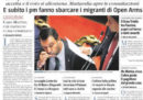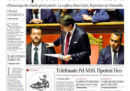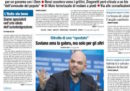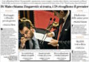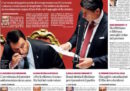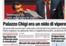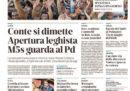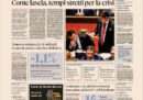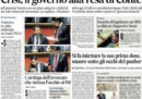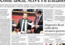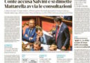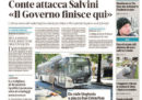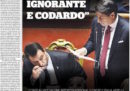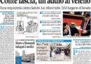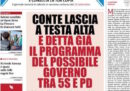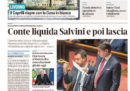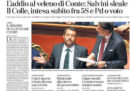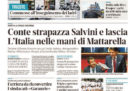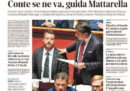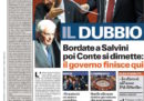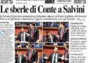 C’è la stessa notizia, naturalmente, sulle prime pagine dei giornali di oggi, e c’è anche la stessa foto (o quasi). Il presidente del Consiglio Giuseppe Conte ieri si è dimesso al termine di un lungo dibattito in Senato, in cui aveva attaccato duramente Matteo Salvini e difeso l’operato del suo governo. Salvini, durante il discorso di Conte, si era mostrato impaziente e un po’ nervoso: le sue espressioni erano state notate e riprese dai giornali già ieri e un paio di foto scattate ieri sono su tutte le prime pagine di oggi.