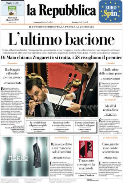 C’è la stessa notizia, naturalmente, sulle prime pagine dei giornali di oggi, e c’è anche la stessa foto (o quasi). Il presidente del Consiglio Giuseppe Conte ieri si è dimesso al termine di un lungo dibattito in Senato, in cui aveva attaccato duramente Matteo Salvini e difeso l’operato del suo governo. Salvini, durante il discorso di Conte, si era mostrato impaziente e un po’ nervoso: le sue espressioni erano state notate e riprese dai giornali già ieri e un paio di foto scattate ieri sono su tutte le prime pagine di oggi.