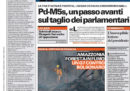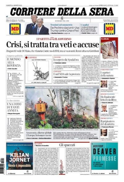 Le prime pagine dei giornali di oggi continuano a occuparsi delle trattative in corso per la formazione di un nuovo governo, tra Partito Democratico e Movimento 5 Stelle. In particolare, diversi giornali scrivono che il nodo/duello/scontro principale riguarda il ruolo che in un eventuale nuovo governo di coalizione potrebbe avere Giuseppe Conte, presidente del Consiglio dimissionario. Altri giornali dedicano molti spazio agli incendi in Amazzonia e i giornali sportivi dedicano le loro prime pagine al campionato italiano di calcio, che ricomincia oggi.