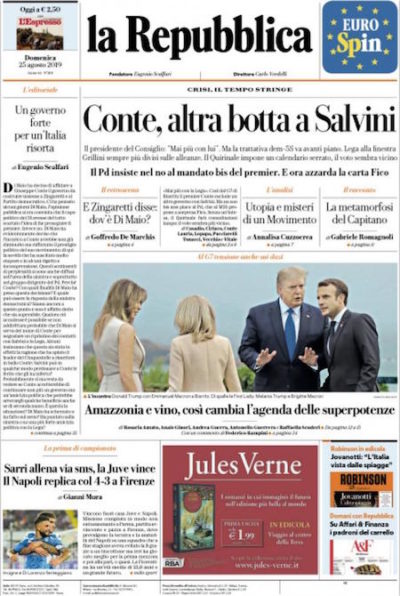 C’è tantissima politica interna sulle prime pagine di oggi, come da due settimane a questa parte. Il tema oggi è la trattativa tra il Partito Democratico e il Movimento 5 Stelle per formare un governo, trattativa di cui i giornali sanno ancora poco e su cui si fanno ipotesi e si raccontano retroscena. C’è chi sostiene che Giuseppe Conte si sia “preso” il Movimento 5 Stelle, chi dice che si stia facendo un tentativo per un governo guidato da Roberto Fico e chi chiede di andare a votare, per lo sfinimento. E poi è ricominciata la Serie A, e si vede soprattutto dall’assenza di titoli sul calciomercato. Ad ogni modo: hanno vinto sia la Juventus che il Napoli, e oggi si giocano tante altre partite.