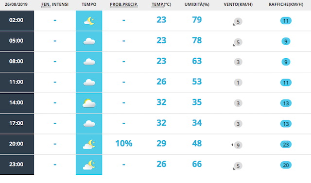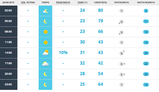 Una bella giornata, con le probabilità di pioggia basse e limitate al primo pomeriggio.