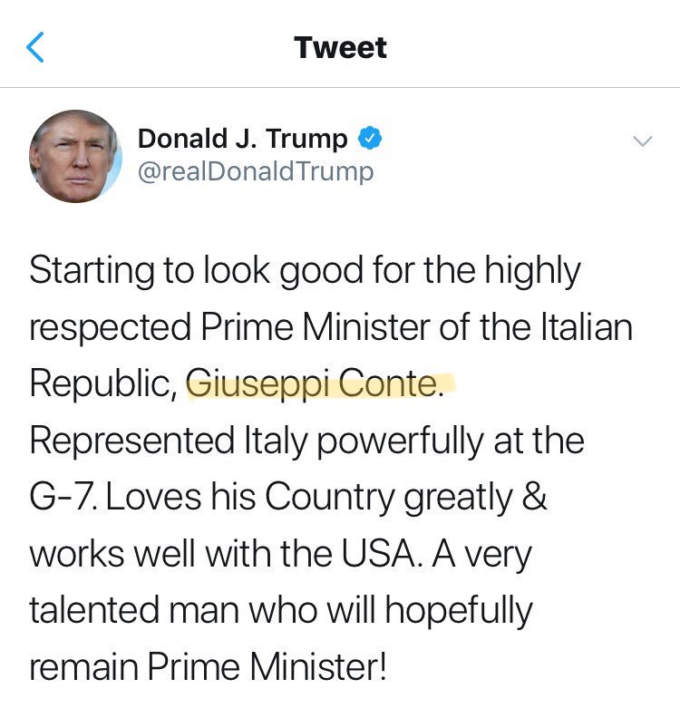 16.22 – Per Giuseppe Conte è arrivato anche un endorsement inaspettato dal presidente americano Donald Trump: «si mette bene per Giuseppi [sic] Conte, il rispettatissimo primo ministro della Repubblica italiana. Al G7 ha rappresentato l’Italia in maniera efficace. Ama il suo paese e lavora bene con gli Stati Uniti. È un uomo di grande talento, che si spera rimanga primo ministro!». Non è la prima volta che Trump sbaglia il nome di Conte: evidentemente è convinto che si chiami così.