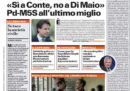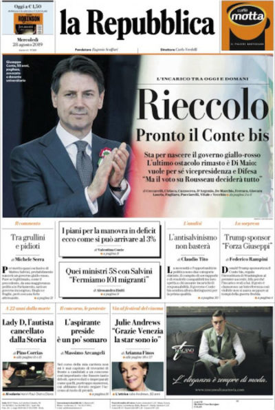 Anche oggi quasi tutte le prime pagine dei giornali parlano delle trattative tra Movimento 5 Stelle e Partito Democratico per formare un nuovo governo: sembra ormai esserci l’accordo su Giuseppe Conte come presidente del Consiglio, e al momento il più grosso ostacolo sembra riguardare il ruolo che potrebbe avere Luigi Di Maio, capo politico del M5S, in un eventuale nuovo governo. Comunque, oggi è il secondo e decisivo giorno del secondo ciclo di consultazioni del presidente della Repubblica. Per il resto, si parla del Festival del cinema di Venezia, che inizia oggi e finirà il 7 settembre, e del calciomercato.