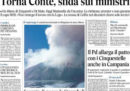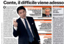 La decisione del presidente della Repubblica Sergio Mattarella di dare l’incarico di provare a formare un governo a Giuseppe Conte è su tutte le prime pagine nazionali: alcune danno la notizia con toni quasi celebrativi, altre invece dimostrano una certa preoccupazione. Le vicende politiche, compreso l’ultimo criptico messaggio inviato da Beppe Grillo, occupano buona parte dei titoli, che lasciano spazio in certi casi alle vicende politiche britanniche, ancora più caotiche. Altri quotidiani pubblicano le foto dell’eruzione a Stromboli. Sono poi gli ultimi giorni di calciomercato, quindi i quotidiani sportivi stanno sparando le ultime cartucce.
