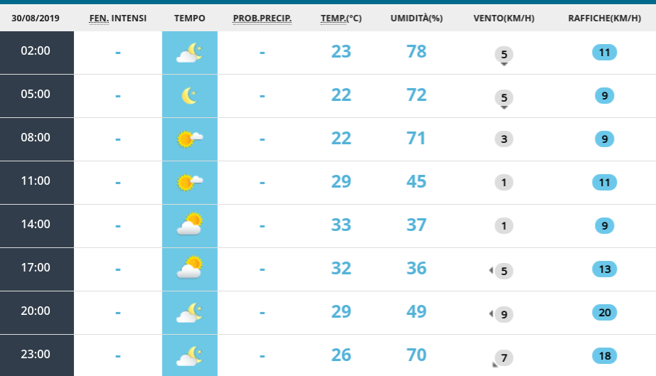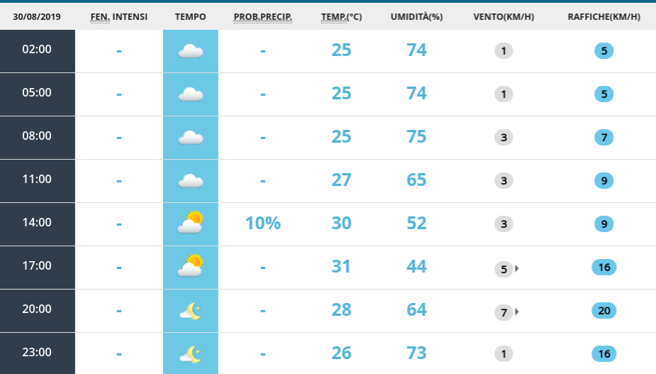 In questi ultimi giorni di agosto non ha fatto tempo bello dappertutto e così sarà anche domani: però almeno le temperature si sono leggermente abbassate rispetto alla “canicola” di Ferragosto, permettendoci di arrivare a fine giornata senza sentirci troppo appiccicosi. Venerdì le nuvole copriranno il Sud, con pioggia prevista in Molise di mattina, mentre di pomeriggio pioverà anche nel Nord-Est, in Sardegna e in provincia di Bologna. Di sera e di notte ci saranno schiarite, con piogge isolate solamente intorno a Sondrio e a Olbia.