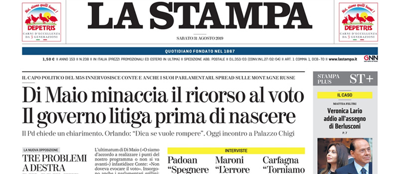 Le prime pagine di sabato 31 agosto 2019