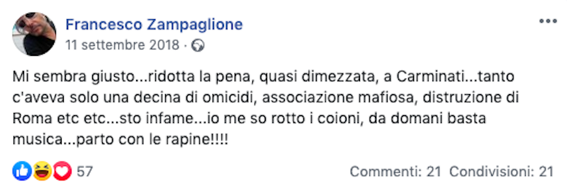 Da diverso tempo sulla sua pagina Facebook aveva iniziato a scrivere post aggressivi e agitati. Negli ultimi tempi se l’era presa parecchio con il ministro dell’Interno uscente Matteo Salvini. Un anno fa si lamentò di una sentenza della Corte d’Appello nell’ambito del caso “Mafia capitale”, ritenendola troppo morbida: «da domani basta con la musica… Parto con le rapine!!!», aveva scritto.