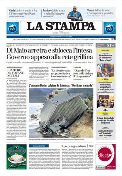 Gli incontri del presidente incaricato Conte con Movimento 5 Stelle e Partito Democratico per la formazione del governo sono in apertura su tutti i giornali di oggi: mentre sembra più vicina l’intesa fra i due partiti, dopo la rinuncia da parte di Di Maio al ruolo di vicepresidente del Consiglio, si attende la consultazione online che avverrà oggi per gli iscritti alla piattaforma Rousseau sull’accordo con il Partito Democratico. Il Sole 24 Ore titola sui nuovi controlli sull’uso dei contanti in vigore da settembre, mentre i quotidiani sportivi si occupano della chiusura del calciomercato.