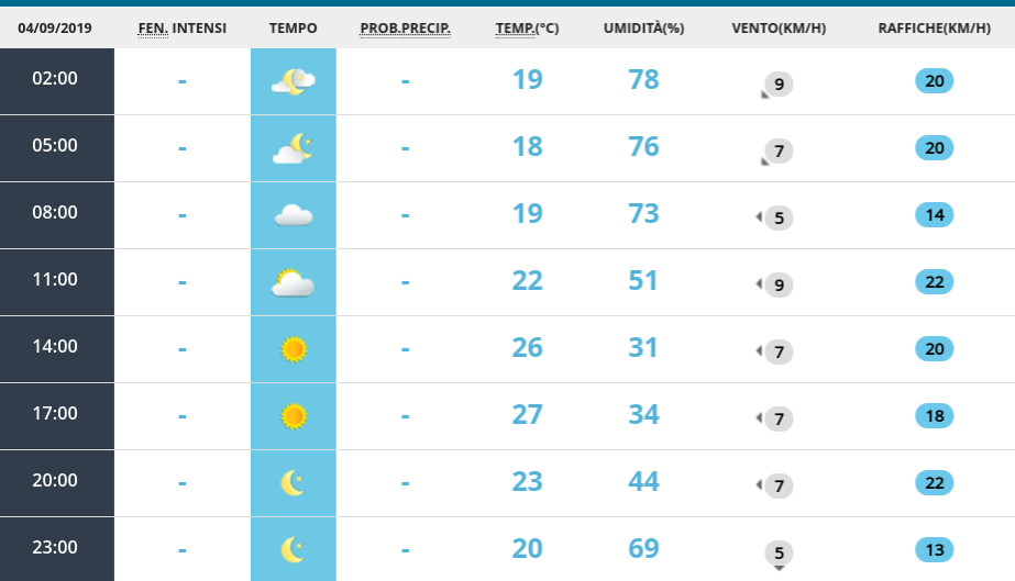 Le previsioni meteo per mercoledì dicono che il brutto tempo di questo inizio settembre ci sarà ancora, ma un po’ meno dei giorni scorsi. Di mattina non dovrebbe piovere da nessuna parte, mentre di pomeriggio si annuvolerà al Sud e pioverà in Sicilia e in provincia di Bari. Al Centro-Nord e al Nord ci sarà il sole, invece. Di sera dovrebbe piovere solamente in Sicilia, mentre di notte ci saranno schiarite anche lì e sul resto della penisola.