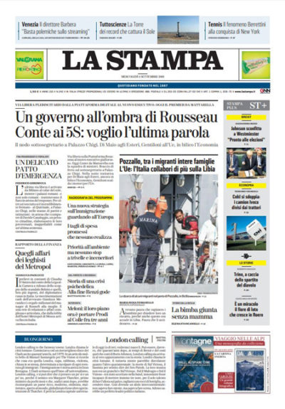 Tutti i giornali di oggi dedicano l’apertura al voto sull’accordo di governo fra Movimento 5 Stelle e Partito Democratico degli iscritti alla piattaforma Rousseau, che a grande maggioranza ha approvato la formazione del nuovo governo; per oggi si aspetta quindi la lista dei ministri e il giuramento al Quirinale.