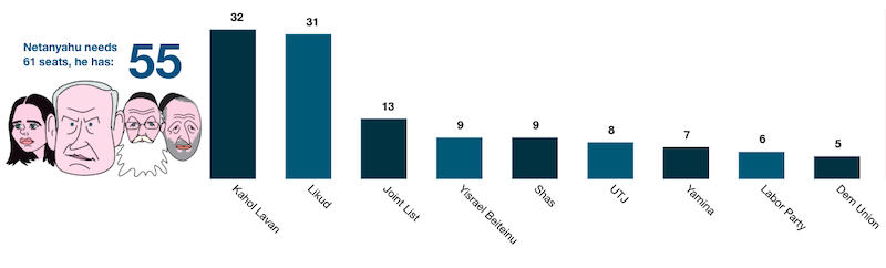 È un esito molto simile a quello di aprile, quando il Likud superò Blu e Bianco di appena 15mila voti, ottenendo il mandato di formare un governo. L’alleanza sempre più stretta fra Netanyahu e la destra religiosa, rappresentata dai partiti dello Shas e della Torah Unita, aveva però provocato l’uscita dalla coalizione di Israel Beytenu, il partito di destra laico e nazionalista guidato da Avigdor Lieberman. Il mancato sostegno di Lieberman aveva impedito a Netanyahu di raggiungere la maggioranza in Parlamento – senza di lui la coalizione di destra rimase con 60 seggi su 120 – provocando di fatto nuove elezioni.