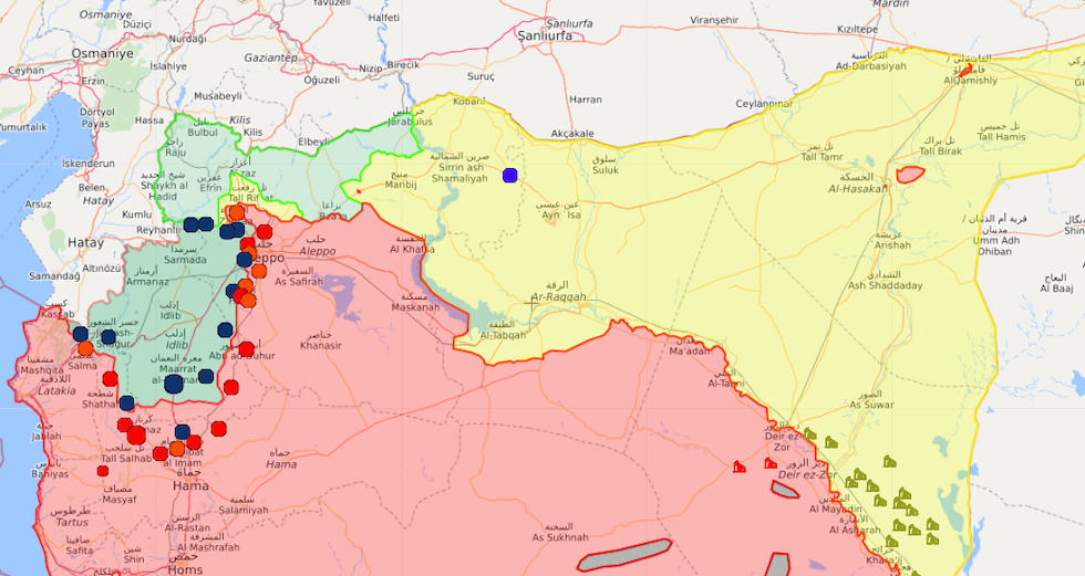 Una mappa aggiornata del nord della Siria. I verdi sono le forze alleate della Turchia, i gialli sono i curdi siriani, i rossi sono il regime di Assad e alleati. La Turchia vorrebbe creare una “safe zone” nei territori oggi in giallo, a est del fiume Eufrate (Liveuamap)