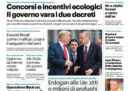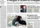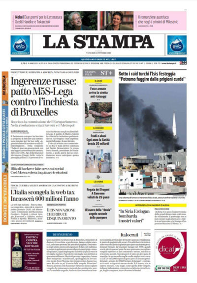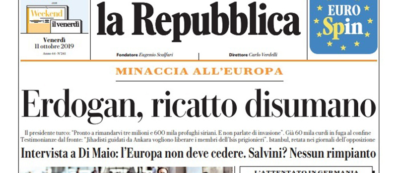 La maggior parte dei giornali di oggi segue in apertura l’avanzata delle operazioni militari turche contro i curdi nel nordest della Siria, e la minaccia del presidente turco Erdoğan all’Unione Europea di lasciar partire per l’Europa oltre tre milioni di profughi presenti in Turchia nel caso continuassero le critiche all’attacco. Altri giornali si occupano dei contenuti della manovra economica e del decreto sull’ambiente approvato ieri dal Consiglio dei ministri, la Stampa apre sulla bocciatura al Parlamento europeo della proposta di istituire una commissione sulle ingerenze elettorali straniere grazie anche al voto contrario di Lega e Movimento 5 Stelle, il Dubbio segue le notizie sulla vicenda di Bibbiano, e la Verità titola sull’indagine sui genitori di Matteo Renzi.