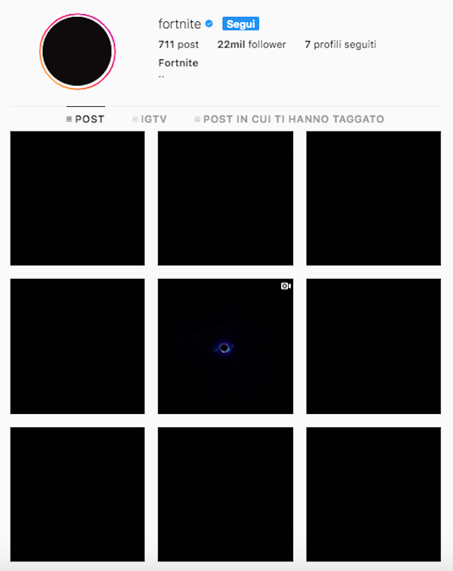 Il tutto è successo al termine di un evento noto come “The End”, in cui si aspettava una qualche fine delle decima stagione (ogni stagione dura in genere una decina di settimane). Il fatto è che dopo “una qualche fine”, ci si aspettava – senza che nel frattempo passasse molto tempo – un nuovo inizio. Invece non è stato così, perché evidentemente Epic Games vuole prendere tempo in vista del prossimo evento, di cui al momento non si sa praticamente nulla. Su Twitter Epic Games ha addirittura cancellato tutti i suoi precedenti tweet, lasciando solo quello che mostra il video in diretta del buco nero virtuale. Su Instagram, invece, la situazione è questa:
