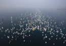 Tra le foto sportive della settimana ci sono quelle dei Mondiali di ginnastica artistica, dove si distinguono le medaglie d’oro di Simone Biles, la felicità del brasiliano Arthur Mariano, ginnaste che sembrano senza testa o fotografate a testa ingiù, anche se in quanto a scenografia se la giocano con un’acrobata in una strada vuota di Tel Aviv. Poi ci sono il maratoneta Eliud Kipchoge che ha stabilito un record – non riconosciuto – per l’atletica correndo la maratona in meno di due ore, precisamente in 1 ora, 59 minuti e 40 secondi, come ci tiene ad indicare e una foto per farvi un’idea della barche alla regata della Barcolana – qui trovate una raccolta più estesa. Mentre per finire, al Gran Premio di Formula 1 del Giappone, valeva la pena fotografare la squadra della Mercedes festeggiare la vittoria del titolo costruttori.