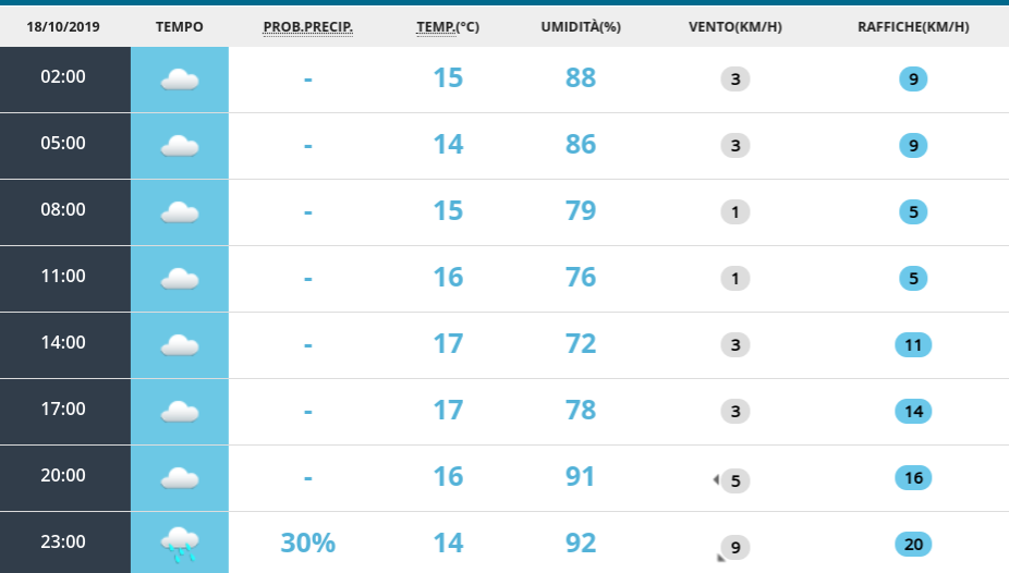 Le previsioni meteo dell’Aeronautica Militare dicono che a Milano farà lo stesso tempo dalle 2 alle 20, senza cambiare mai: nuvoloso. Dopo le 20 potrebbe piovere.