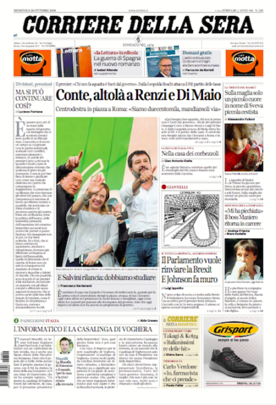 Ci sono molte foto della manifestazione della destra di sabato a Roma, sulle prime pagine dei giornali di oggi: con Matteo Salvini, Giorgia Meloni e Silvio Berlusconi insieme sul palco o tra molte bandiere. E poi si parla di come va nel governo, con gli attriti tra i partiti della maggioranza sulla legge di bilancio. Che sia per intimargli di dimettersi o per attribuirgli “altolà” o qualche slogan, leggerete molte volte il nome di Giuseppe Conte, nei titoli di apertura. Sui giornali sportivi infine si parla di una sola cosa: la vittoria di ieri della Juventus contro il Bologna.