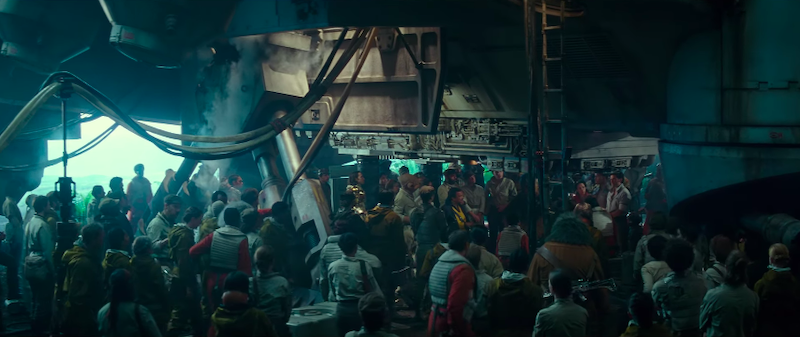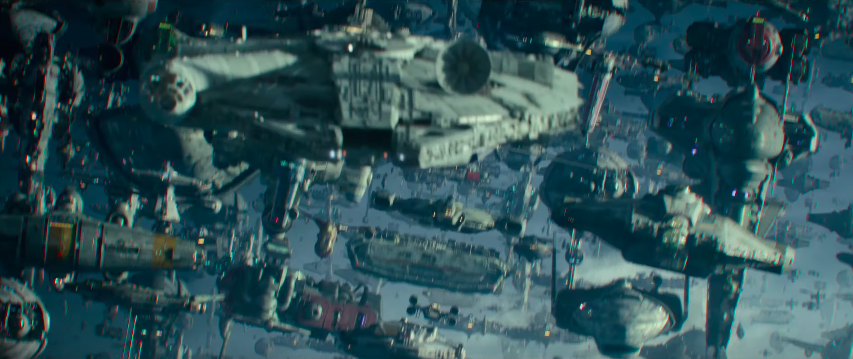 In una delle scene più affollate del trailer vediamo decine di astronavi della Resistenza allinearsi per quella che sembra una battaglia. Anche questa scena ne ricorda una già vista nel Ritorno dello Jedi, la battaglia finale intorno alla seconda Morte Nera. Esattamente come allora, a guidare la carica c’è il Millennium Falcon, l’astronave di Han Solo. In basso a destra alcuni impallinati hanno riconosciuto Ghost, l’astronave dei protagonisti della serie animata Star Wars Rebels, andata in onda dal 2013 al 2018.