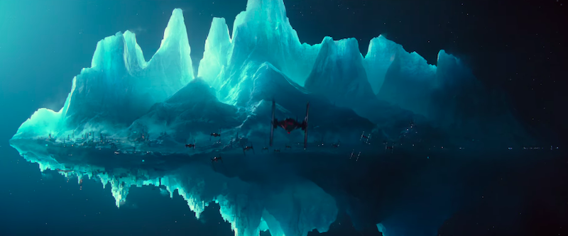 In una delle scene più affascinanti del trailer si vedono alcune astronavi del Primo Ordine volare verso un enorme iceberg, che sembra galleggiare su un pianeta buio e coperto d’acqua. Il pianeta dovrebbe chiamarsi Kijimi e comparirà per la prima volta nella saga in uno dei romanzi ufficiali, Force Collector, che uscirà un mese prima dell’Ascesa di Skywalker.