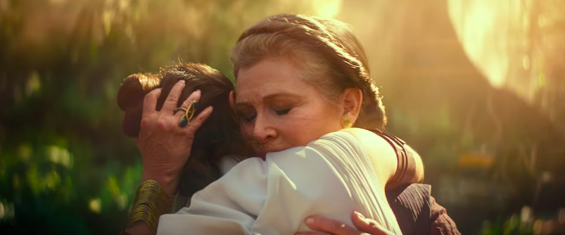 Nella scena successiva emerge dalla giungla un’astronave piuttosto riconoscibile ai fan della saga: è il primo oggetto animato che viene mostrato nella prima scena del primissimo film, uscito nel 1977. È la storica astronave della Principessa Leia, quella che viene catturata da Darth Vader nei minuti iniziali del film. Dalla successione delle immagini nel trailer possiamo immaginare che Leia faccia visita a Rey sulla luna boscosa di Endor. Carrie Fisher è morta nel dicembre del 2016, ma sarà presente nell’Ascesa di Skywalker perché nel film sono state inserite alcune scene girate e poi tagliate nel Risveglio della Forza, settimo film della saga nonché primo dell’ultima trilogia.