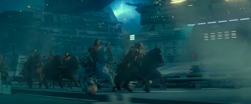 Fra le cose più bizzarre viste nel trailer, a un certo punto un gruppo di personaggi guidati da Finn fa partire una carica in sella a quelli che sembrano dei cavalli. In un frammento successivo ricostruiamo che tutta la scena si svolge nello spazio. Grazie a una puntata dello show ufficiale di Star Wars su YouTube apprendiamo che i cavalli sono in realtà degli orbaks, cioè dei cavalli più grossi e pelosi.