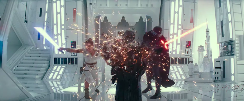 Verso la fine, il trailer mostra ulteriori rimandi al Ritorno dello Jedi: Rey e Kylo Ren si scontrano nella sala del trono della seconda Morte Nera, quella in cui Darth Vader uccideva l’Imperatore (o almeno così credevamo).