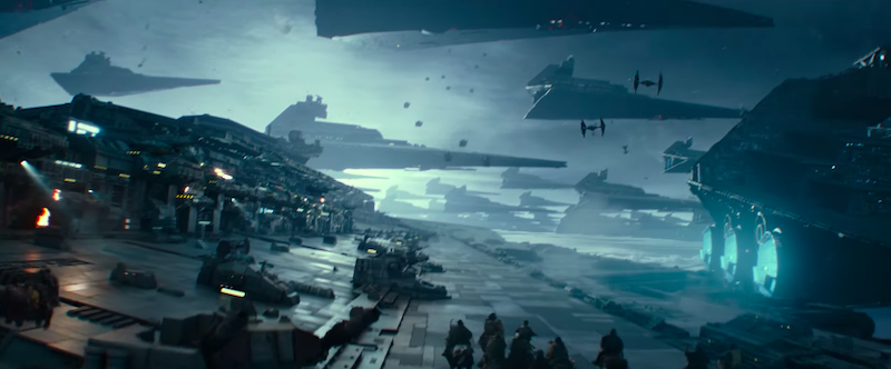 In una delle scene più affollate del trailer vediamo decine di astronavi della Resistenza allinearsi per quella che sembra una battaglia. Anche questa scena ne ricorda una già vista nel Ritorno dello Jedi, la battaglia finale intorno alla seconda Morte Nera. Esattamente come allora, a guidare la carica c’è il Millennium Falcon, l’astronave di Han Solo. In basso a destra alcuni impallinati hanno riconosciuto Ghost, l’astronave dei protagonisti della serie animata Star Wars Rebels, andata in onda dal 2013 al 2018.